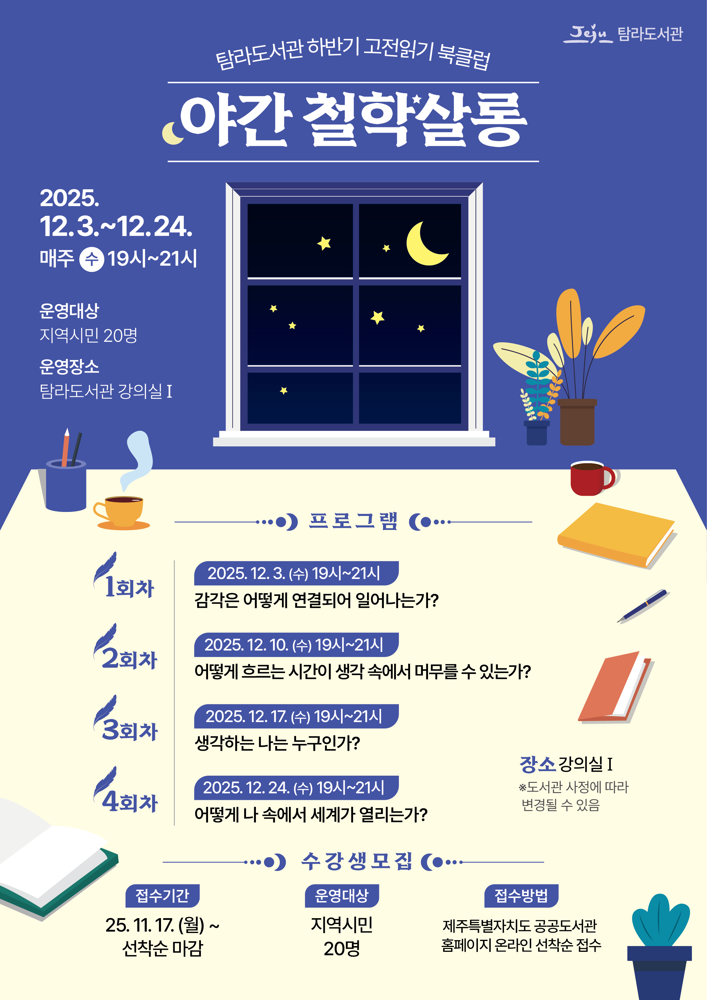 탐라도서관 하반기 고전읽기 북클럽 <야간 철학살롱>을 운영합니다.