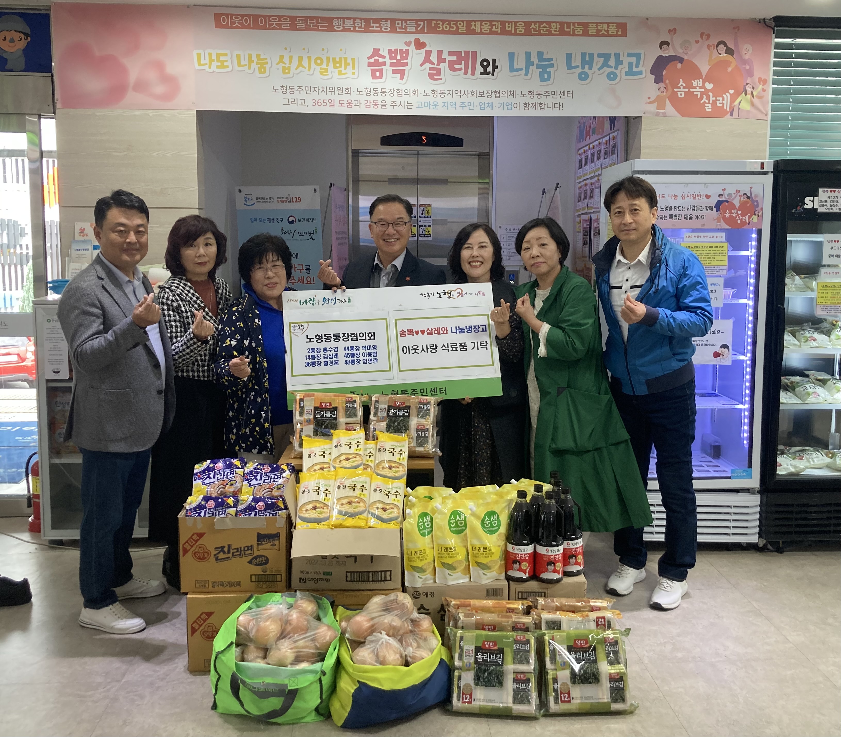 ❍ 노형동통장협의회(회장 현상진) 통장 일동은 11. 7.(금) 노형동주민센터(동장 고광수) 1층에서 운영하는 『솜뽁 ♥♥ 살레와 나눔냉장고』에 라면, 양파, 김 등의 식료품을 기부했다.