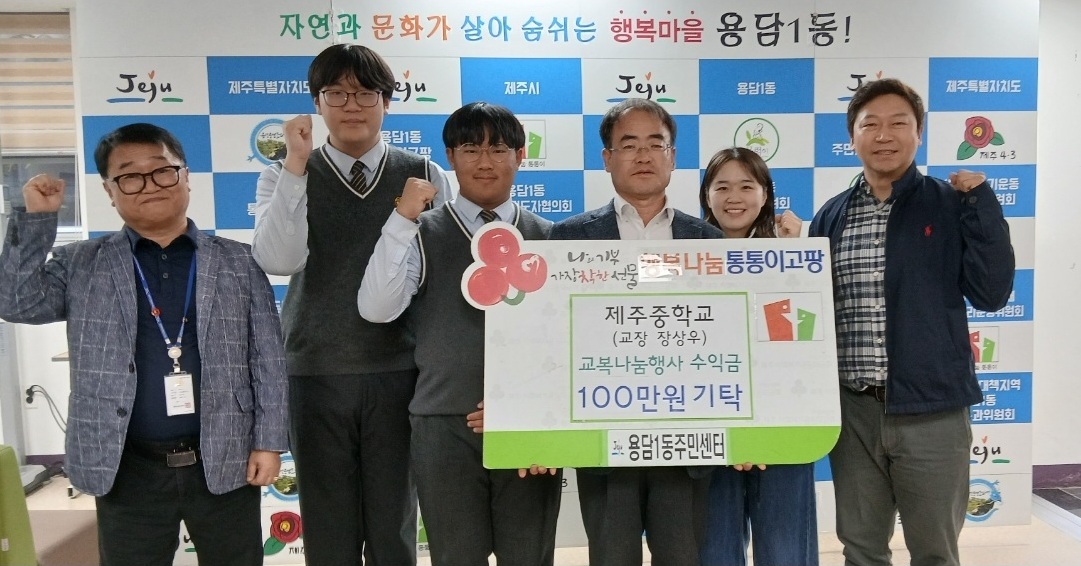 이번 기부금은 제주중학교에서 주최한 교복나눔행사 수익금으로 마련되었으며, 전달받은 기부금 100만원은 용담1동 주민센터와 용담1동 지역사회보장협의체(공동위원장 강재선·최영만)에서 운영하고 있는 통통이고팡에 비치될 물품을 구매하는 데 이용될 예정이다.