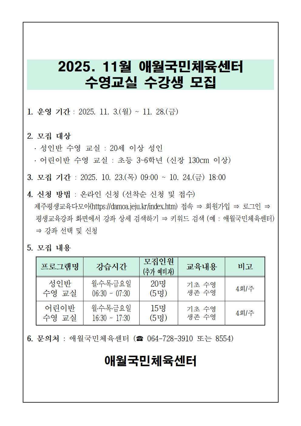 2025년 11월 애월국민체육센터 무료 수영교실 모집 안내