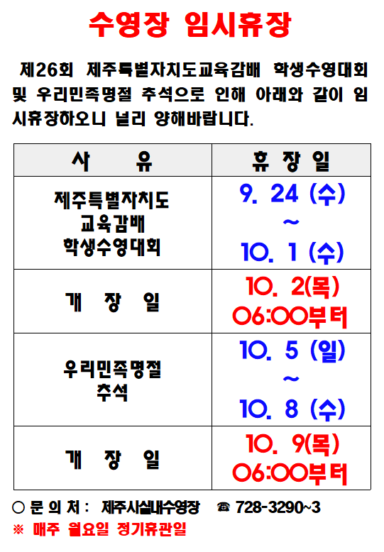 종합경기장 실내수영장 9월 및 추석연휴 임시휴장안내