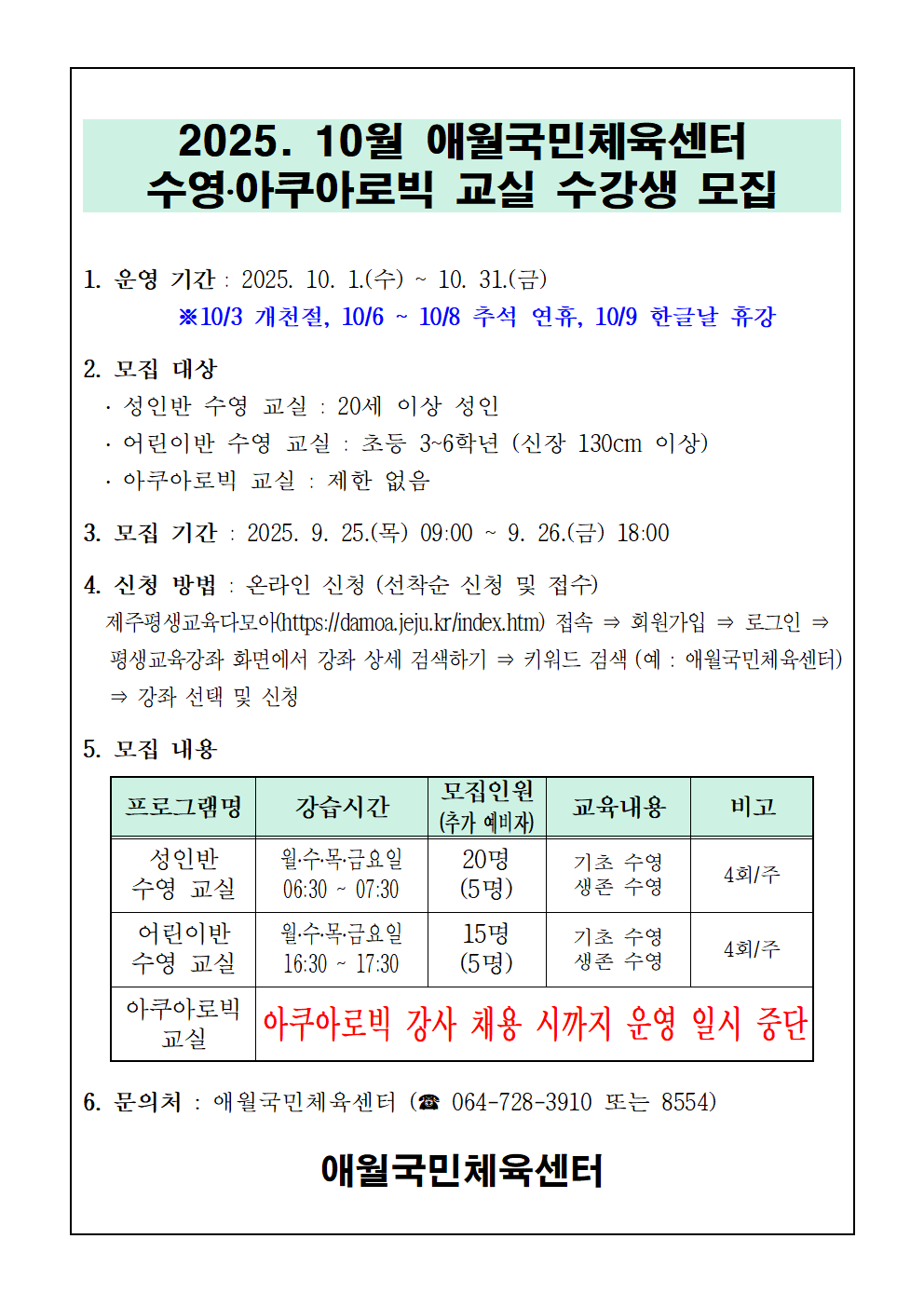2025년 10월 애월국민체육센터 무료 수영교실 모집 안내입니다.