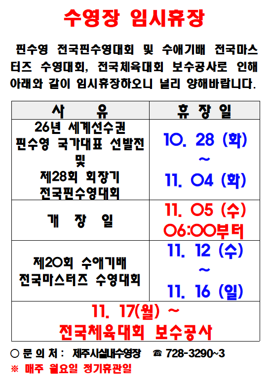 제주종합경기장 실내수영장 임시휴장일정안내입니다.