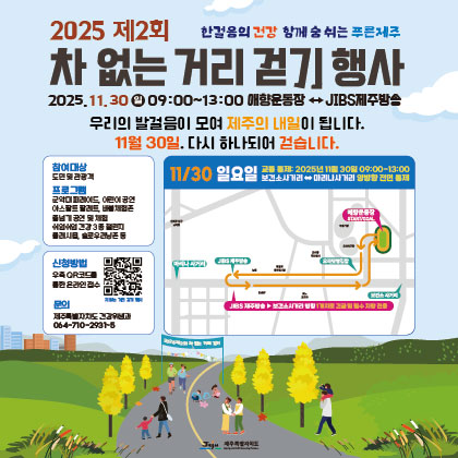 범 도민 탄소 중립 실천과 걷기 중심 건강 생활 실천 분위기 확산으로 건강 도시 조성을 위해 오는 11월 30일(일) 애향 운동장 및 연삼로 일대에서 2025년 제 2회‘차 없는 거리’걷기 행사가 개최됩니다. 차 없는 거리 걷기 행사의 원활한 진행을 위하여 11. 12.부터 11.28.까지 사전 접수 신청을 받고 있으니(붙임 참조), 도민과 관광객이 많은 관심 바랍니다.