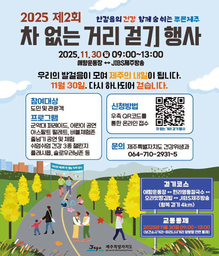 범 도민 탄소 중립 실천과 걷기 중심 건강 생활 실천 분위기 확산으로 건강 도시 조성을 위해 오는 11월 30일(일) 애향 운동장 및 연삼로 일대에서 2025년 제 2회‘차 없는 거리’걷기 행사가 개최됩니다. 차 없는 거리 걷기 행사의 원활한 진행을 위하여 11. 12.부터 11.28.까지 사전 접수 신청을 받고 있으니(붙임 참조), 도민과 관광객이 많은 관심 바랍니다.